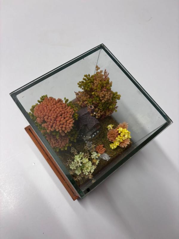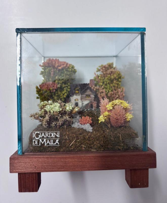 Elegante composizione in miniatura racchiusa in una teca di vetro trasparente con base in legno naturale. Ideale come complemento d’arredo, elemento da esposizione o oggetto da collezione, la teca garantisce protezione e durata nel tempo, valorizzando l’aspetto scenografico dell’opera.