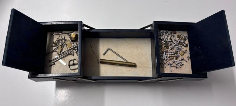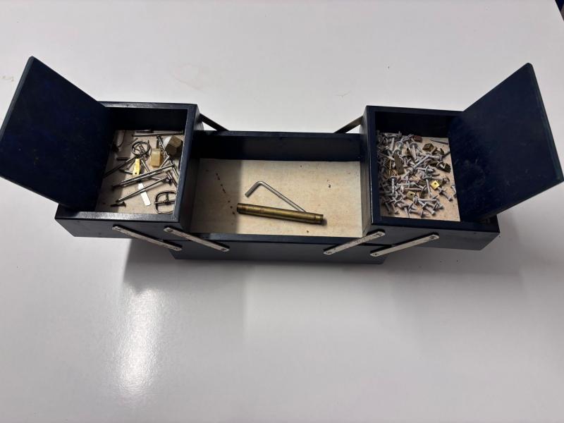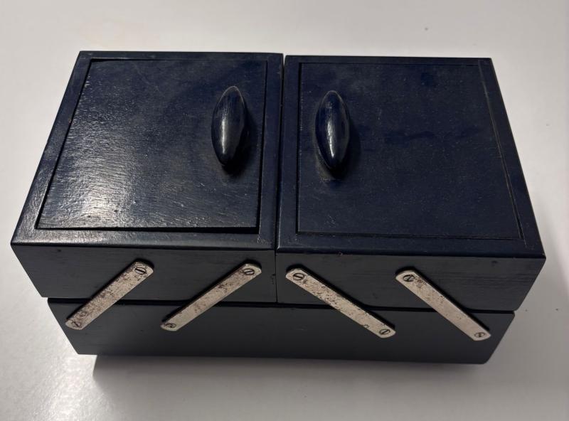 Contenitore artigianale in legno verniciato nero, dotato di struttura a doppio scomparto con apertura a libro tramite leve metalliche laterali. L’interno è suddiviso in più vani di diversa dimensione, ideali per riporre minuterie, viti, chiodi, bulloncini e piccoli utensili. Il sistema meccanico di apertura consente un facile accesso al contenuto e una perfetta organizzazione degli oggetti.