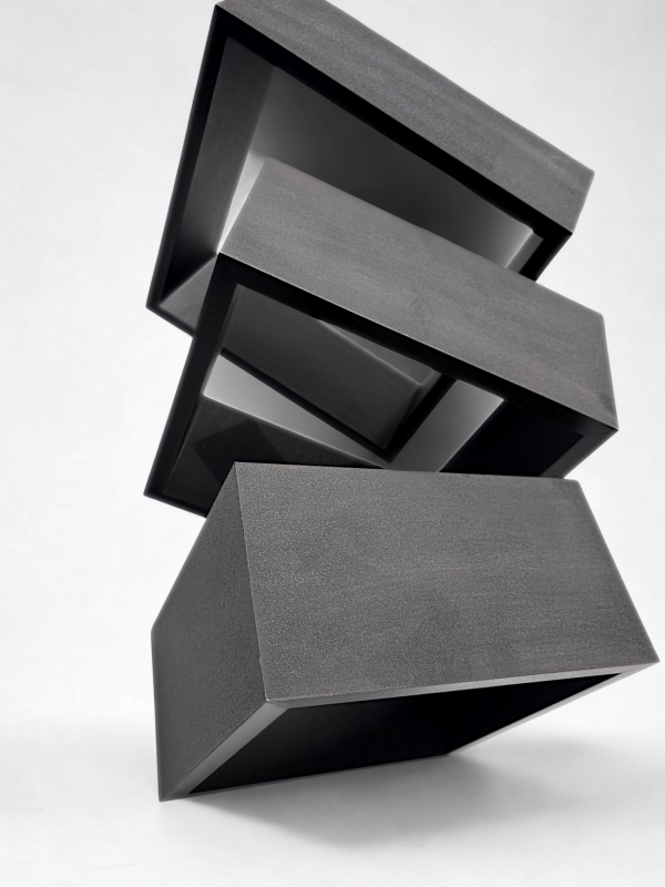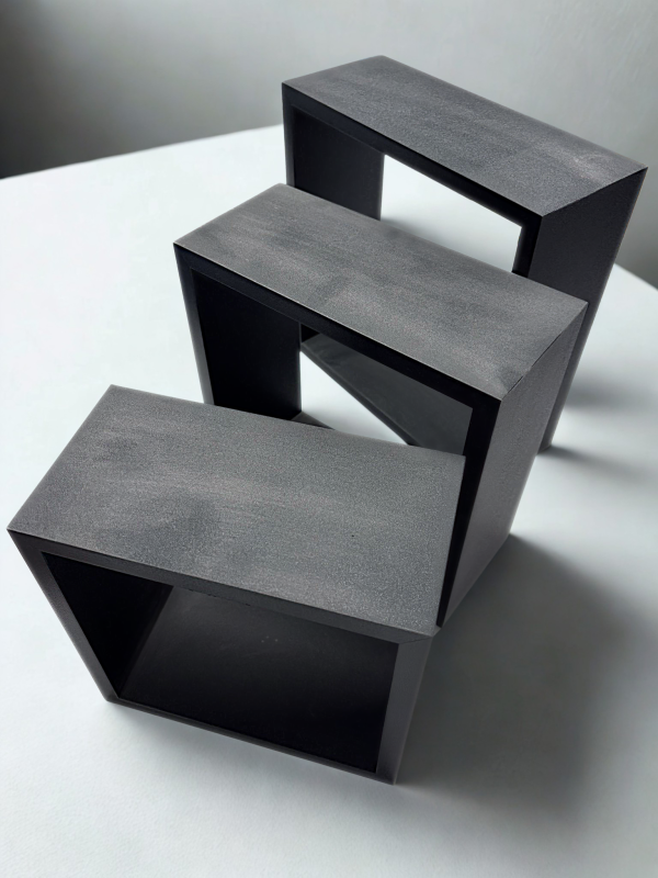 Composto da tre elementi di forma rettangolare, questo set di mensole modulari è realizzato in legno verniciato con finitura opaca color nero antracite. Le linee pulite e geometriche rendono il design essenziale e contemporaneo, ideale per ambienti moderni, minimal o industriali.